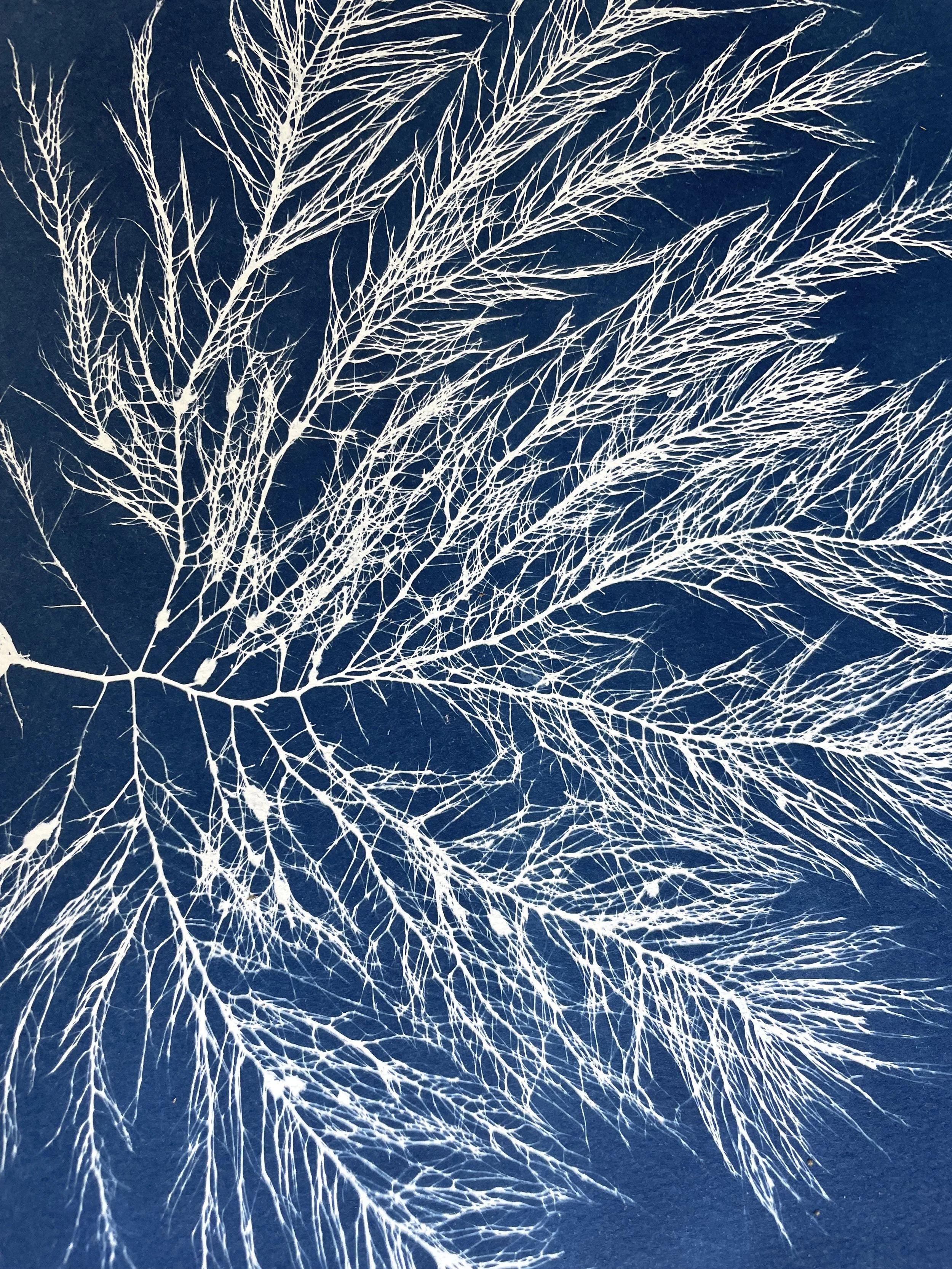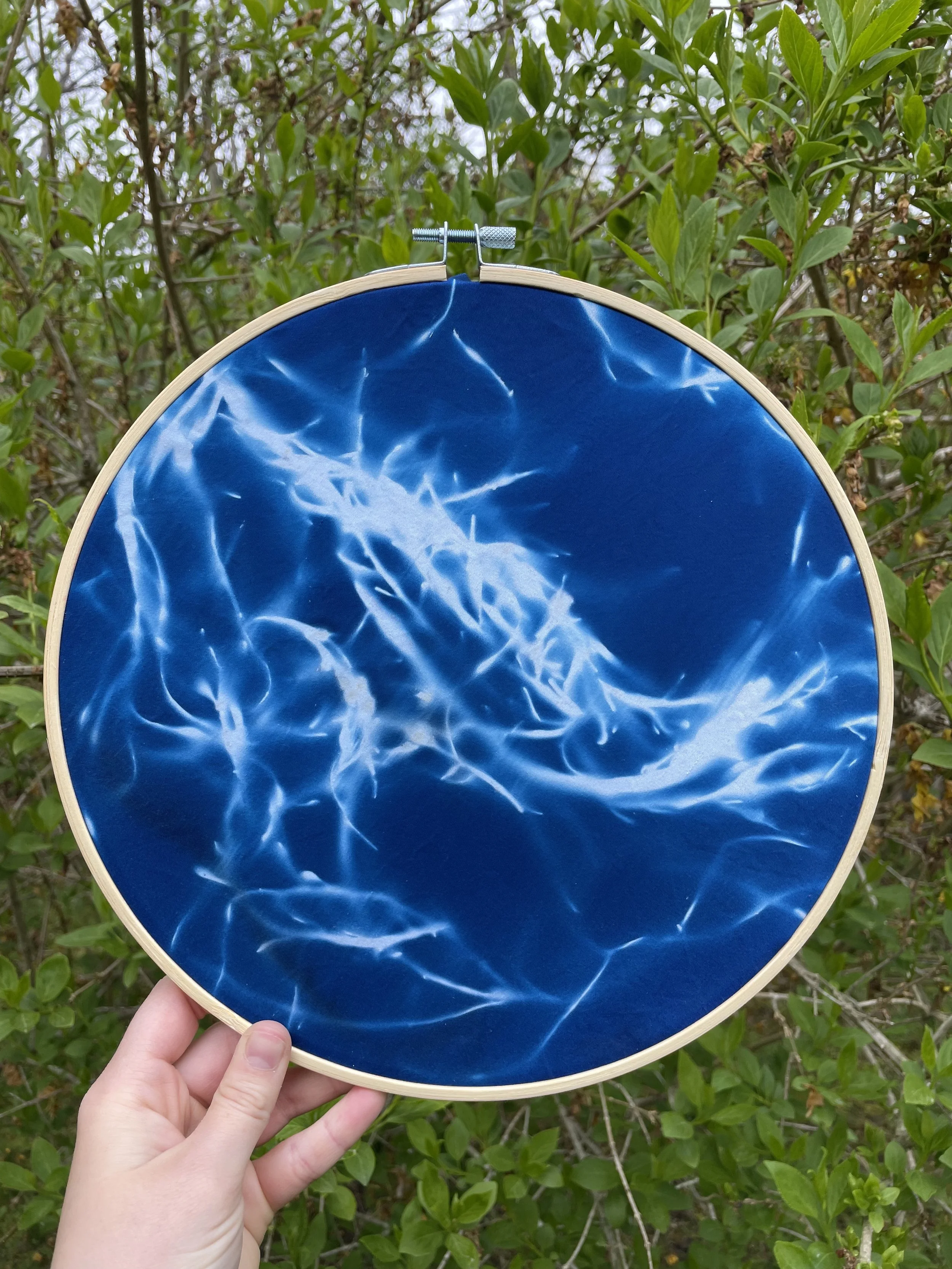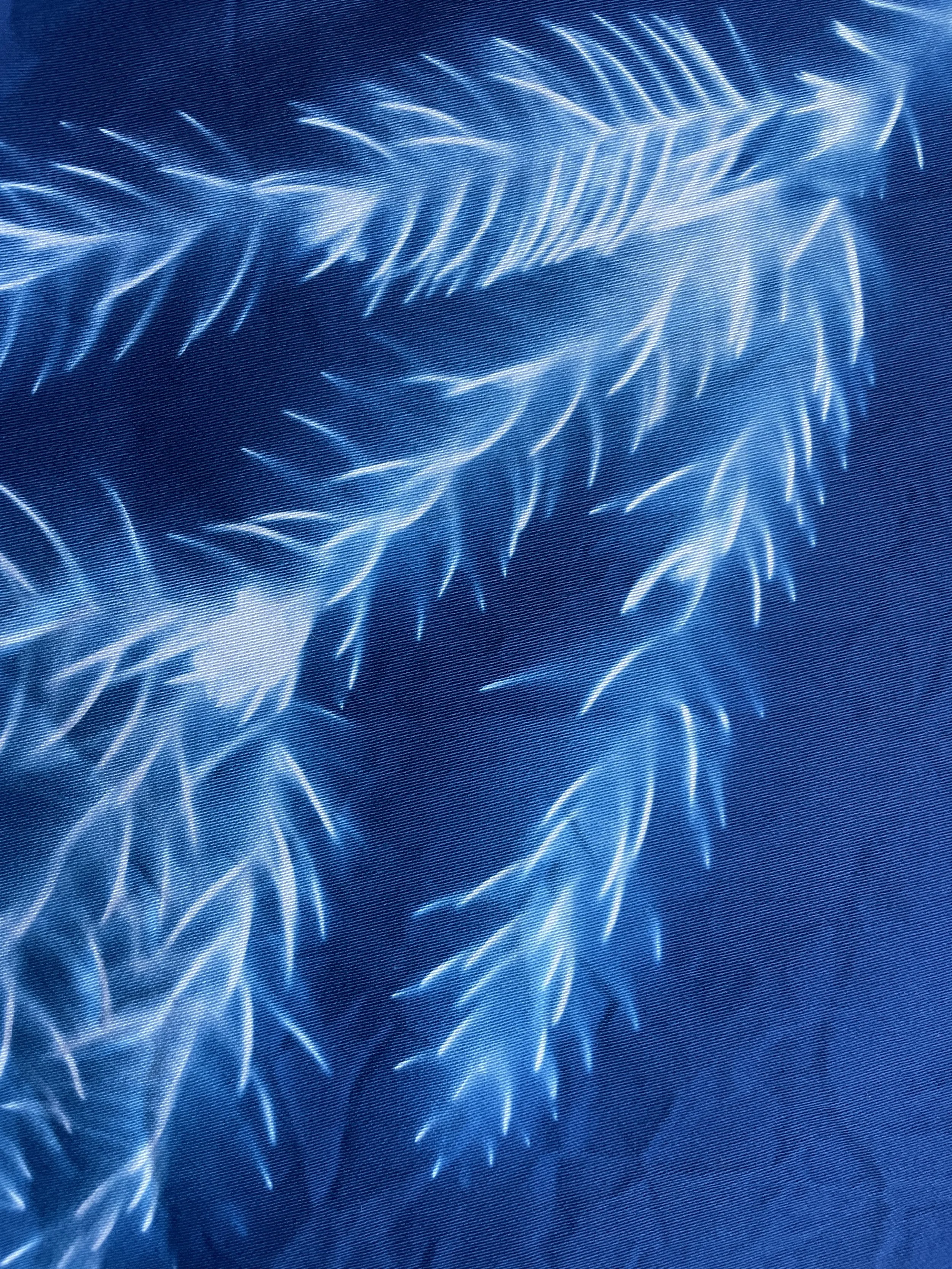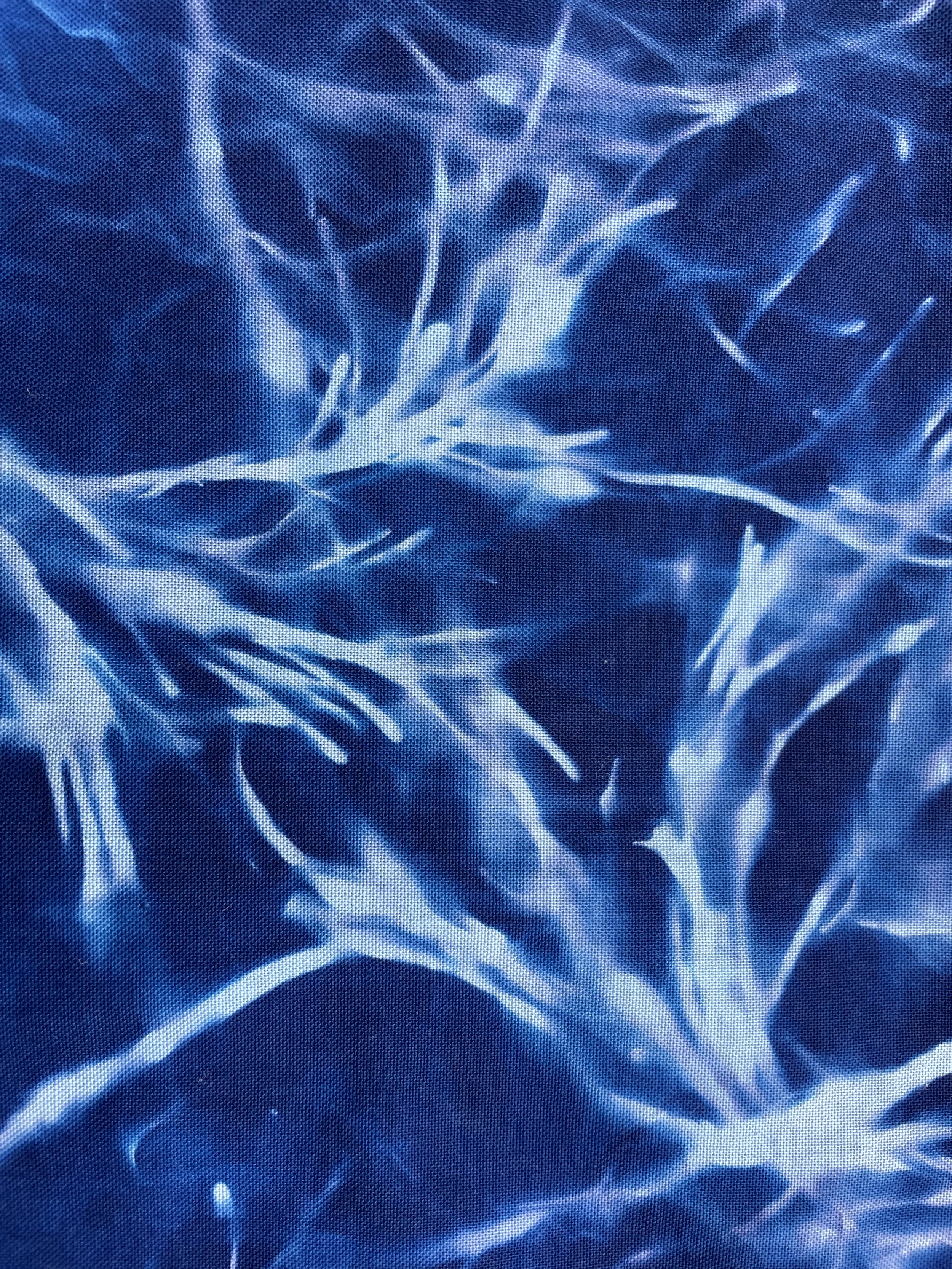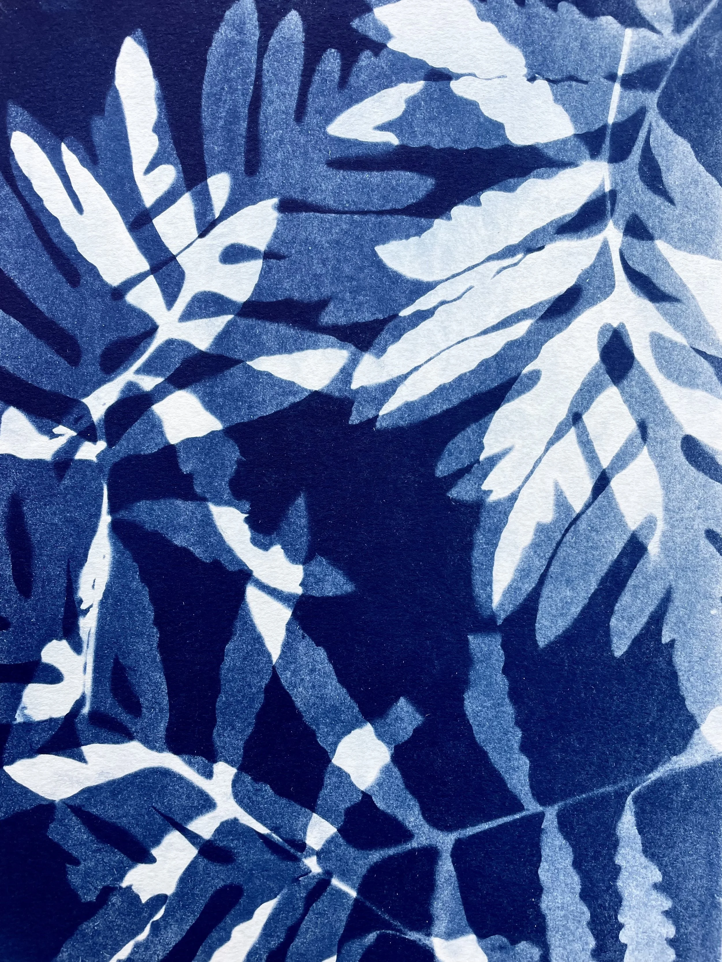 Cyanotype is a photographic printing process that yields a cyan-blue print and utilizes two chemicals: equal volumes of ferric ammonium citrate and potassium ferricyanide. Discovered by John Herschel in 1842, it was designed to reproduce copies of something, also known as blueprints. The mixture is coated onto any absorbable surface (usually paper or fabric), then left to dry in a dark place. Prints can be made by exposing the coated surface to either artificial light or sunlight with a negative placed onto it, such as a transparent film or everyday object. After varied amount of time exposed to light, the surface is then rinsed with water to wash off the leftover chemical mixture, resulting in a darkened blue print after mixing with oxygen in the air.