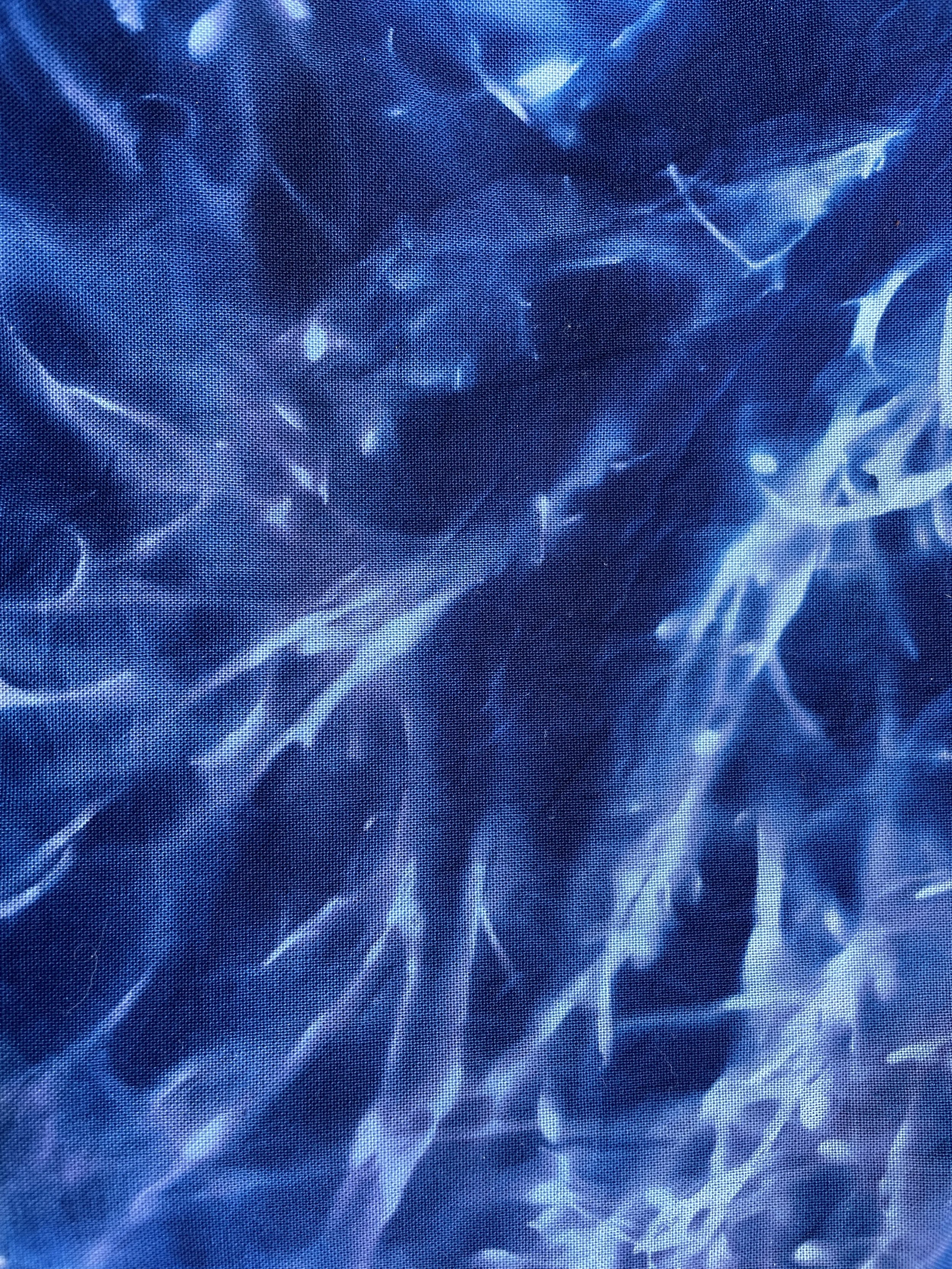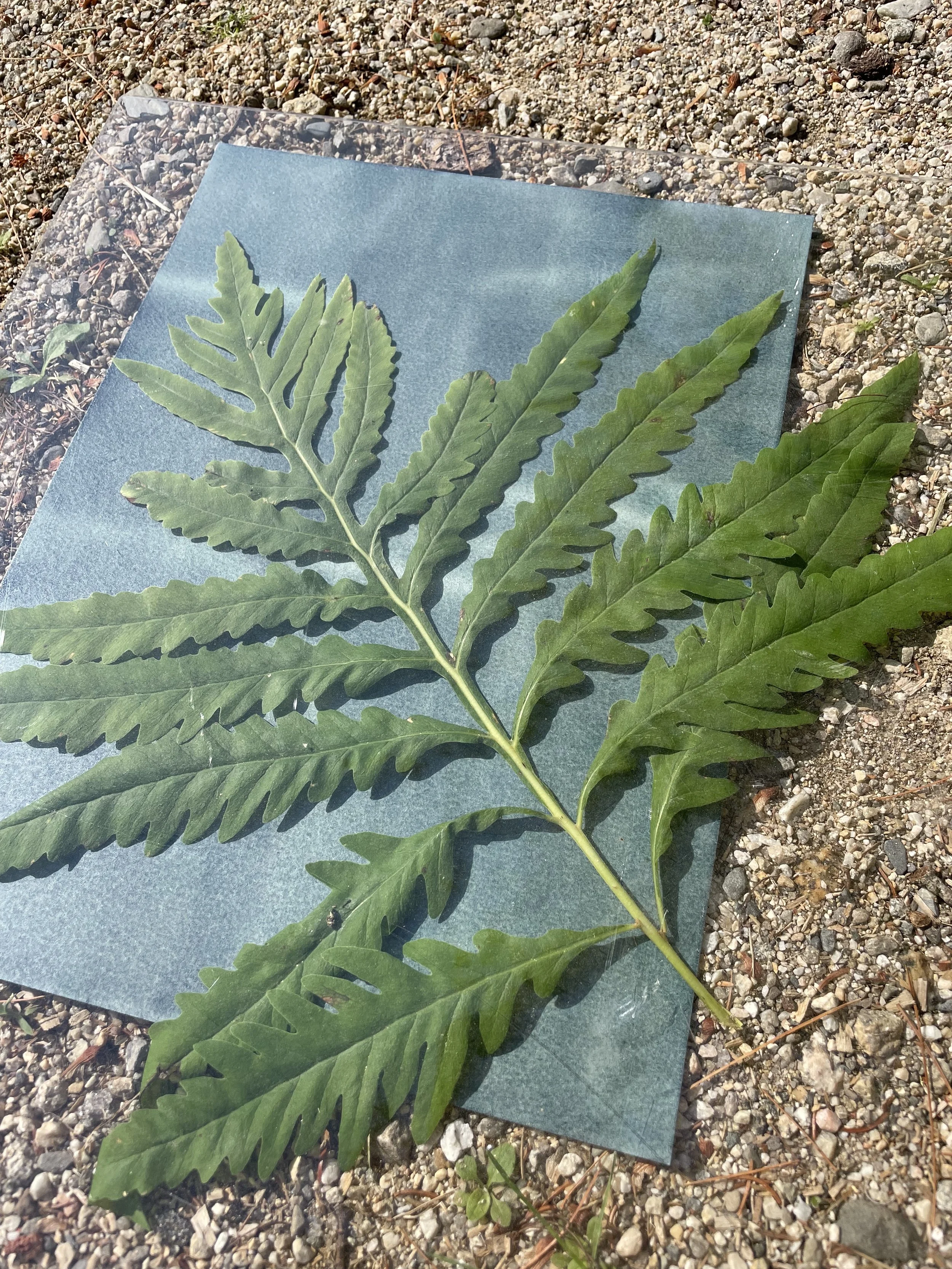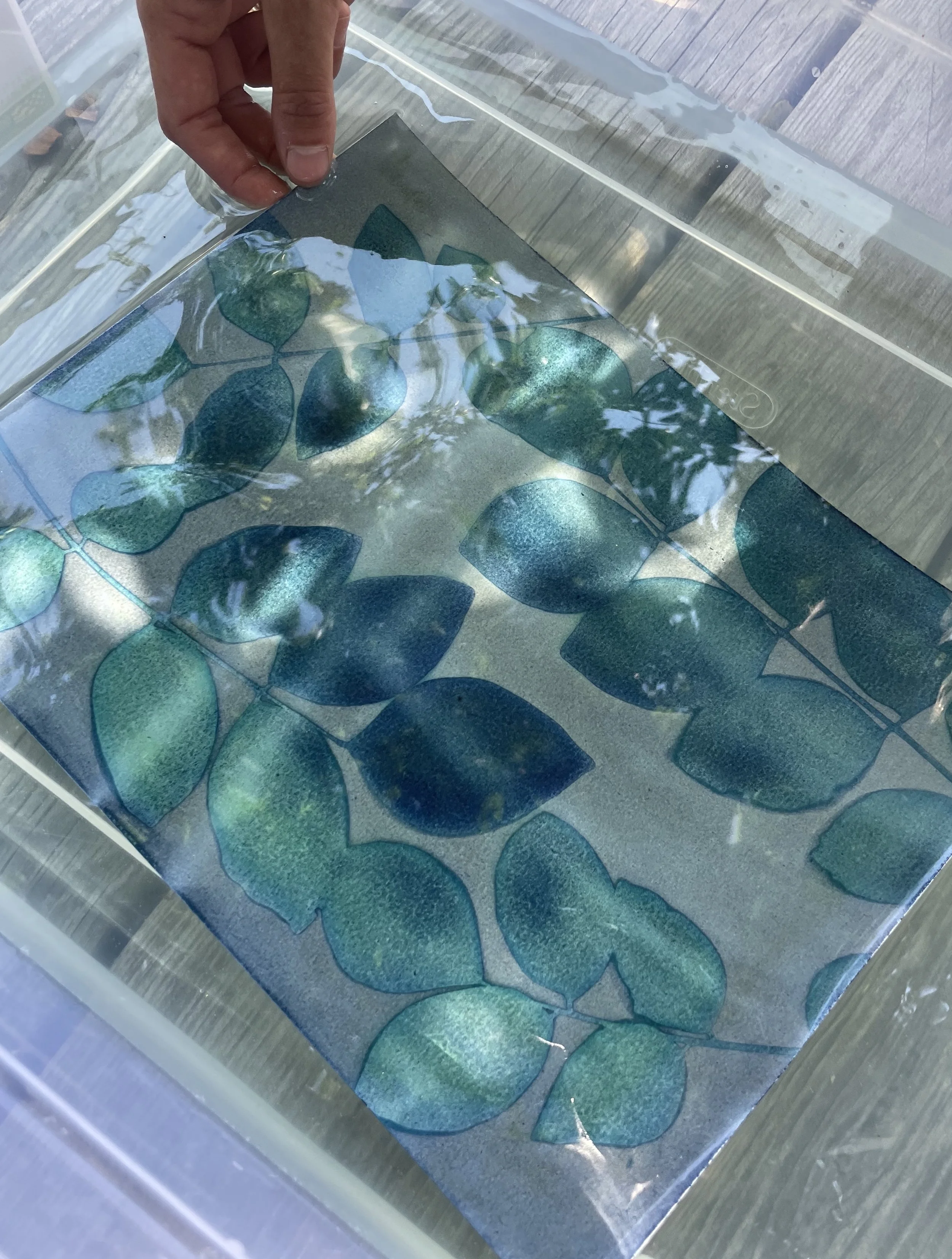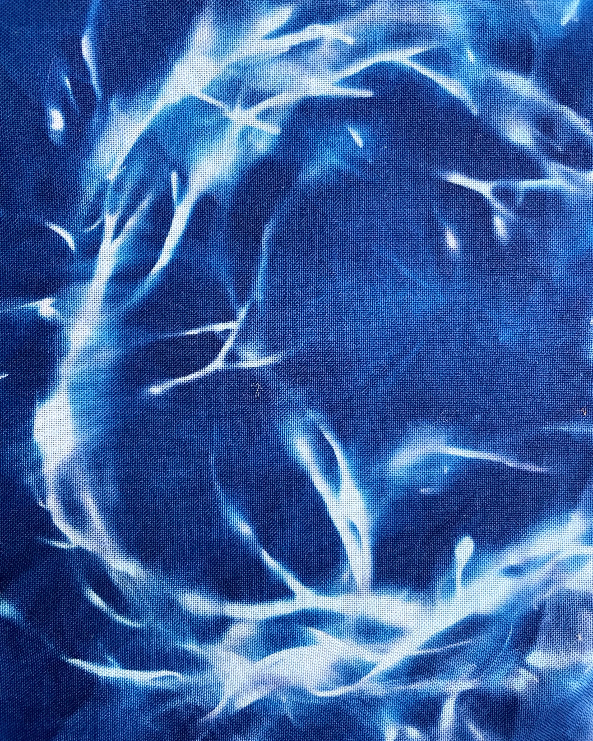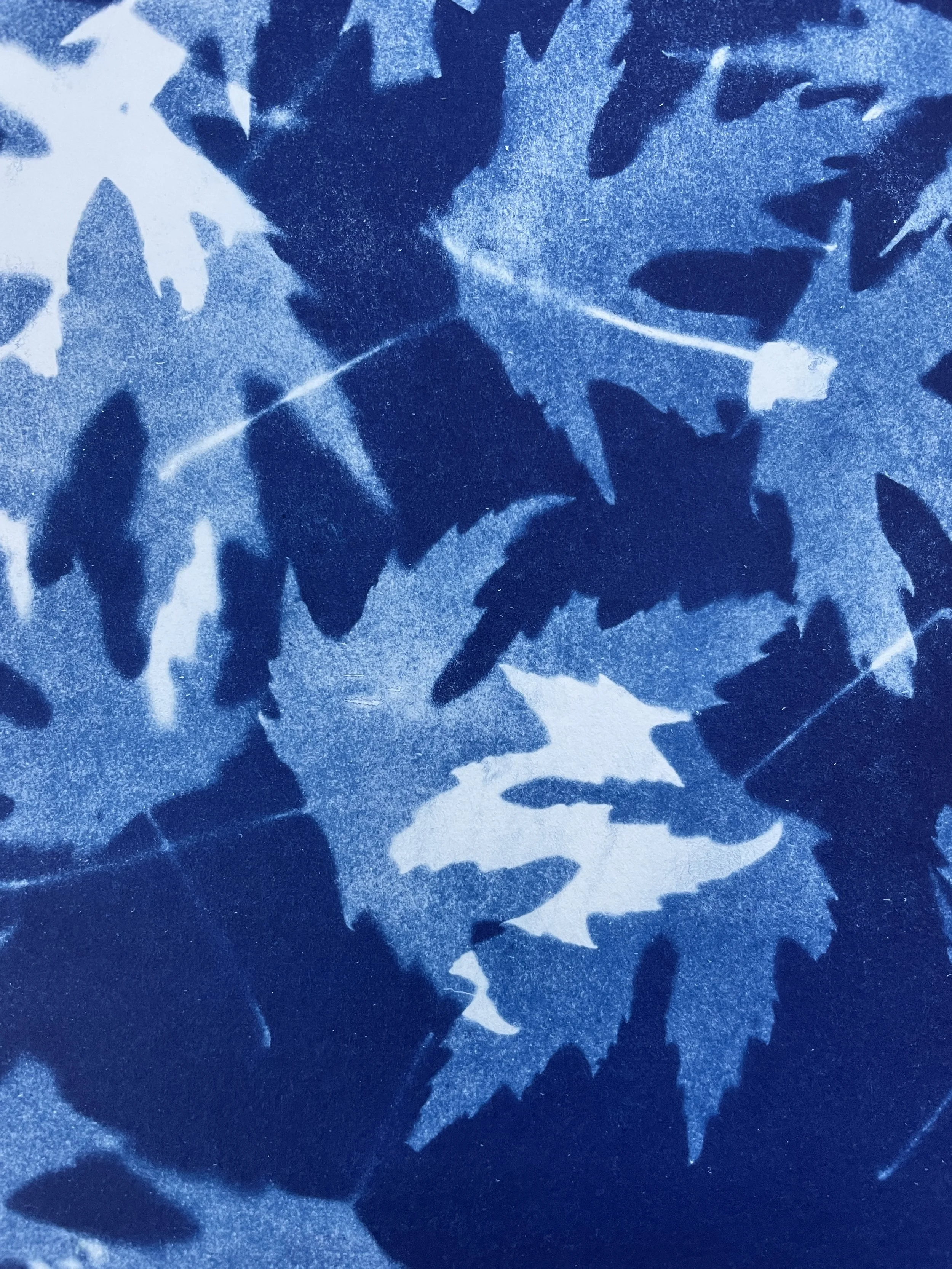 Cyanotype is a photographic printing process that yields a cyan-blue print and utilizes two chemicals: equal volumes of ferric ammonium citrate and potassium ferricyanide. Discovered by John Herschel in 1842, it was designed to reproduce copies of something, also known as blueprints. The mixture is coated onto any absorbable surface (usually paper or fabric), then left to dry in a dark place. Prints can be made by exposing the coated surface to either artificial light or sunlight with a negative placed onto it, such as a transparent film or everyday object. After varied amount of time exposed to light, the surface is then rinsed with water to wash off the leftover chemical mixture, resulting in a darkened blue print after mixing with oxygen in the air.