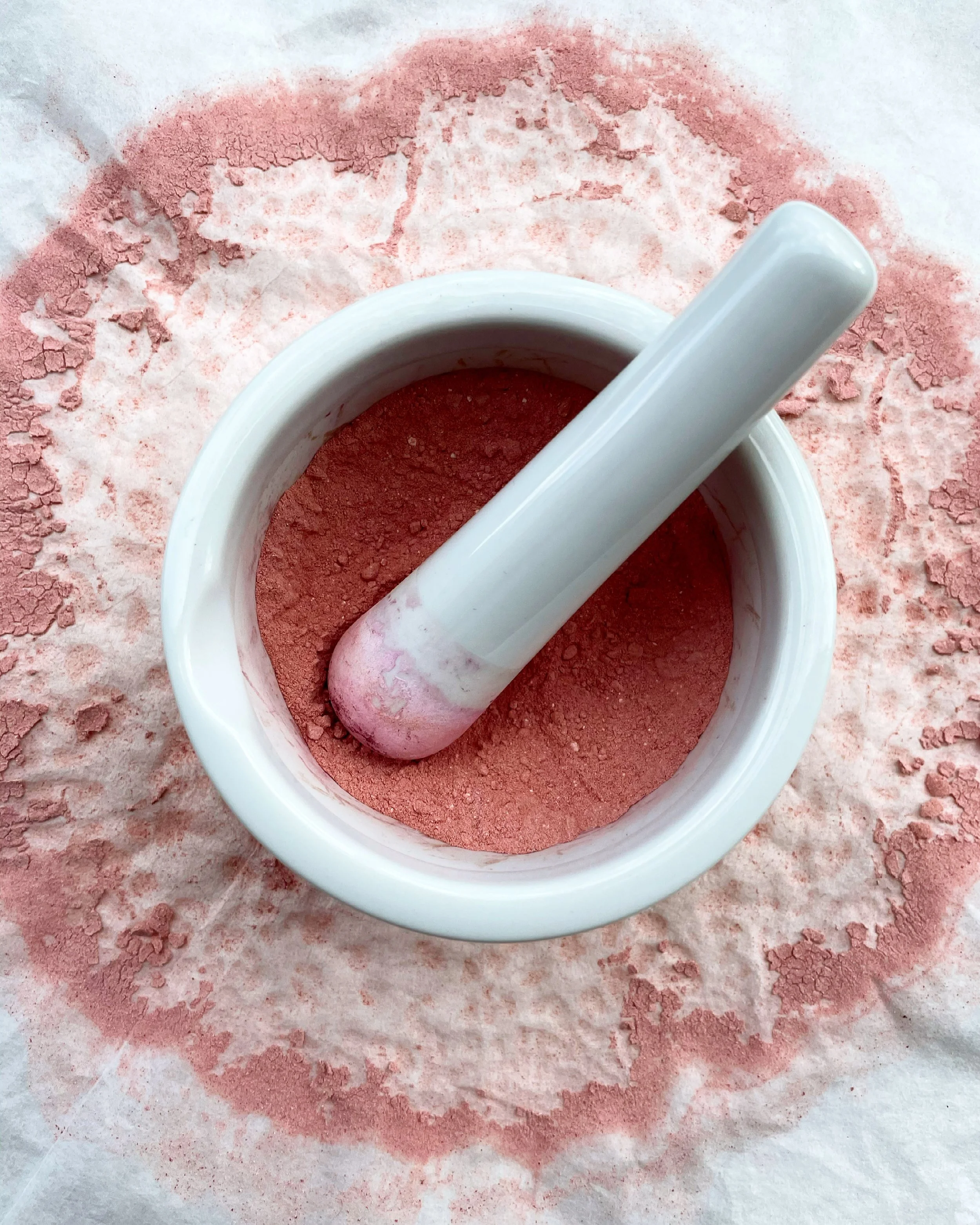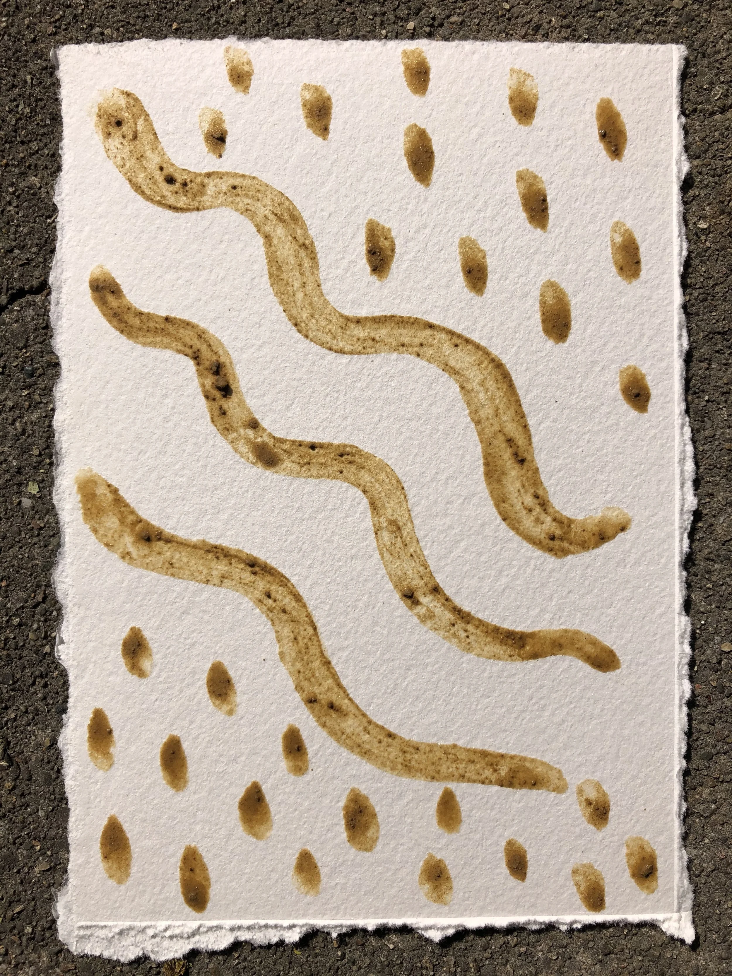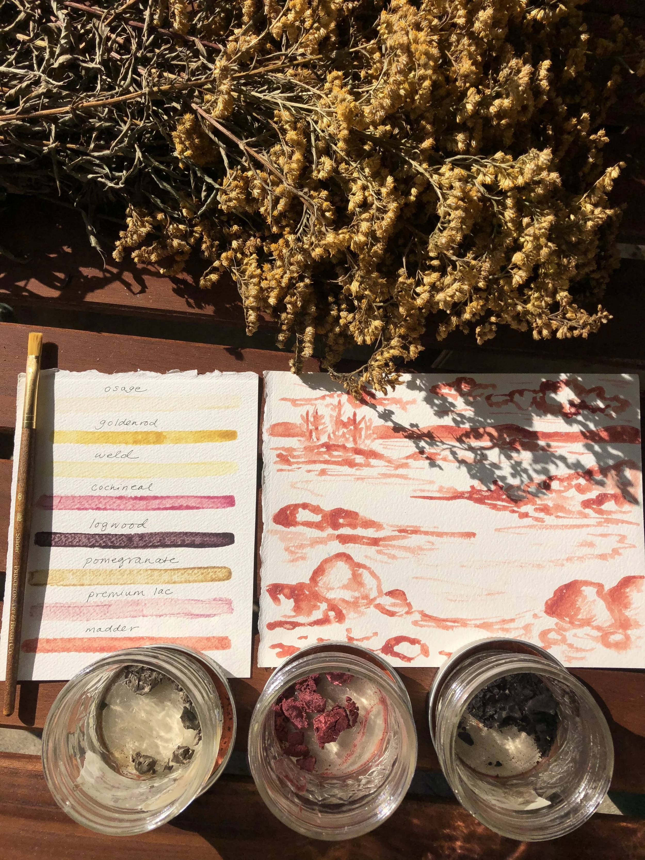 Natural dyeing is a multifaceted, interconnected field of making and exploration. There are many ways to recycle materials, water, and more when natural dyeing. One method that saves water and material is the process of creating pigments using recycled water from a natural dye bath pot. Once you’re done dyeing, save the water to make something new out of it, and continue to utilize the color that is still available for future making! There are several recipes and steps for creating handmade paint pigments and ink, however, after some practice calculating and working with the additive salts, it can be a fun, easy way to reuse and preserve natural color. Calcium carbonate (chalk) is used to help separate the water in the dye from the actual pigment, which then settles to the bottom and is strained in order for it to dry. At this point the pigment is a ‘cake’, which can be ground down into a finer powder. That powder can then be mixed with other additives or mediums for painting such as gum arabic or honey. Vinegar and other additives can also be utilized when added to a natural dye bath for a faster, more immediate way to paint. Happy experimenting!